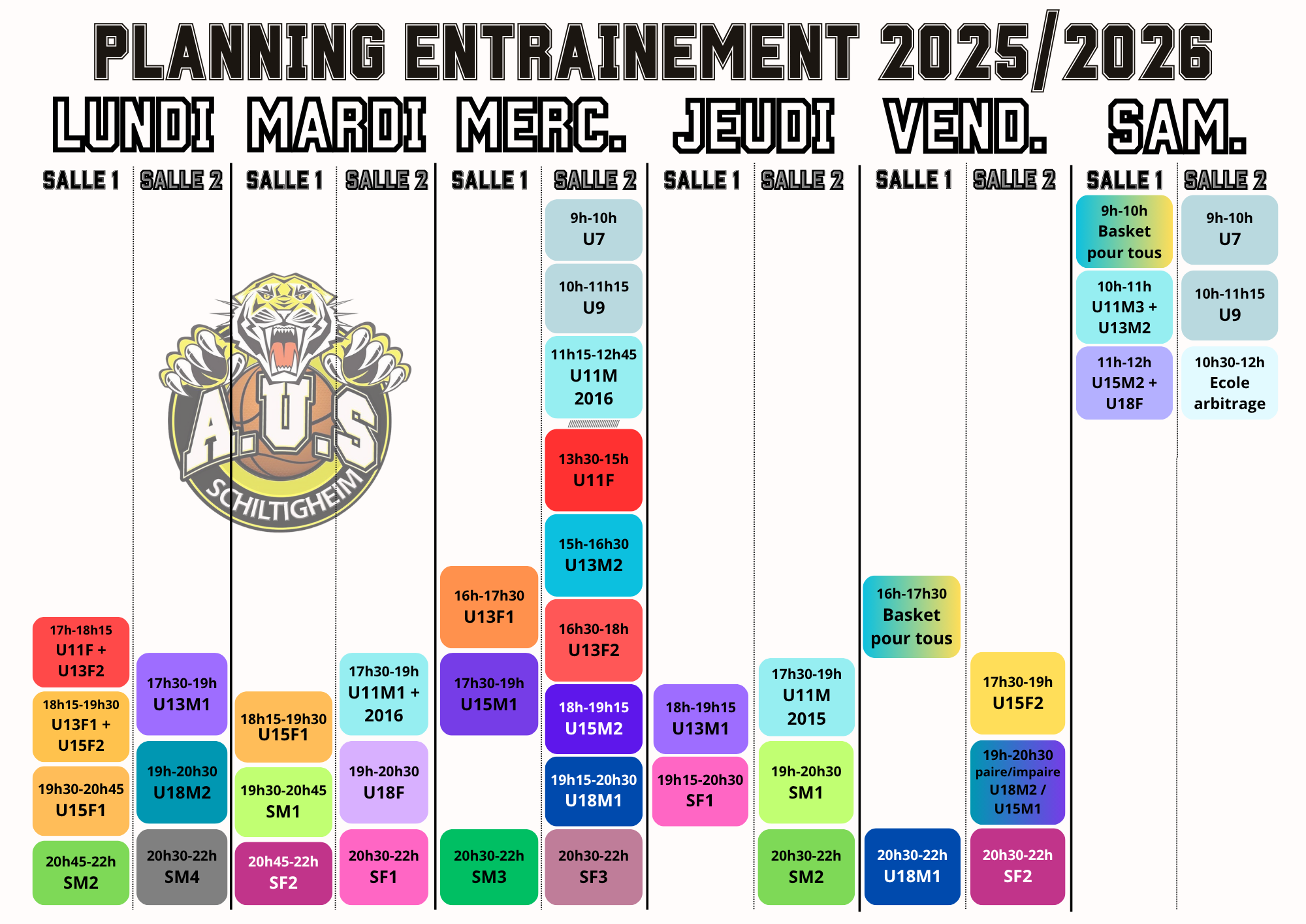 Planning des entraînements Saison 2025/ 2026 Valable à partir du 1er septembre 2025 et jusqu’au 4 juillet 2026, hors jours fériés et vacances scolaires